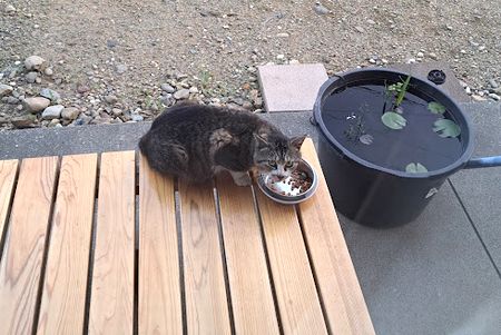 って、わけで、野良ネコか他所のネコを手なずけようと考えた。外縁に餌をおいておびき寄せて手なずけようと。
