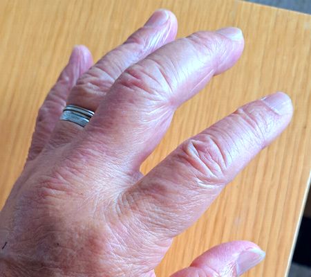 それっきり、自分で揉んだり湿布貼ったり様子を見ていたが、ひと月ほどで、指はまっすぐ伸ばせなくなってくるし、腫れもあるような…